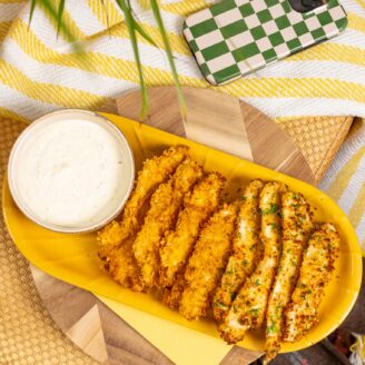 Jogurtimarinaadis fileešašlõkk herne-ürdidipi ja suvise salatiga
