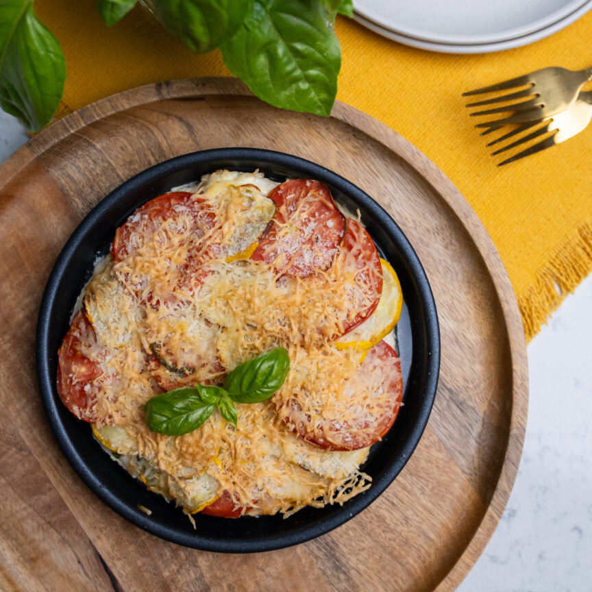Lõika suvikõrvits õhukesteks viiludeks ja sega soola, purustatud küüslaugu ning rebitud basiilikulehtedega. Viiluta tomat ja pane majapidamispaberile nõrguma. Määri kuumaõhufritüüri vorm kergelt õliga ning lao põhja minutipihvid. Pigista suvikõrvitsaviilud käte vahel kuivemaks ja lao need vaheldumisi tomativiiludega kana peale. Sega riivitud Parmesan pankoga ja puista köögiviljadele. Nirista peale veidi õli.